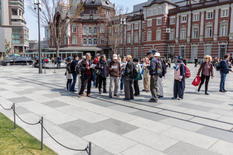 | 駅前広場でオリエンテーション(案内人 鎌田芳郎さん) | 行幸通りより東京駅駅舎を見る |